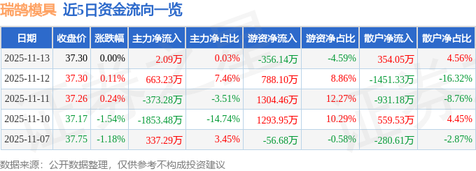 证券之星音讯,到2025年11月13日收盘,瑞鹄模具(002997)报收于37.3元,上涨0.0%,换手率1.0%,成交量2.09万手,成交额7760.9万元。