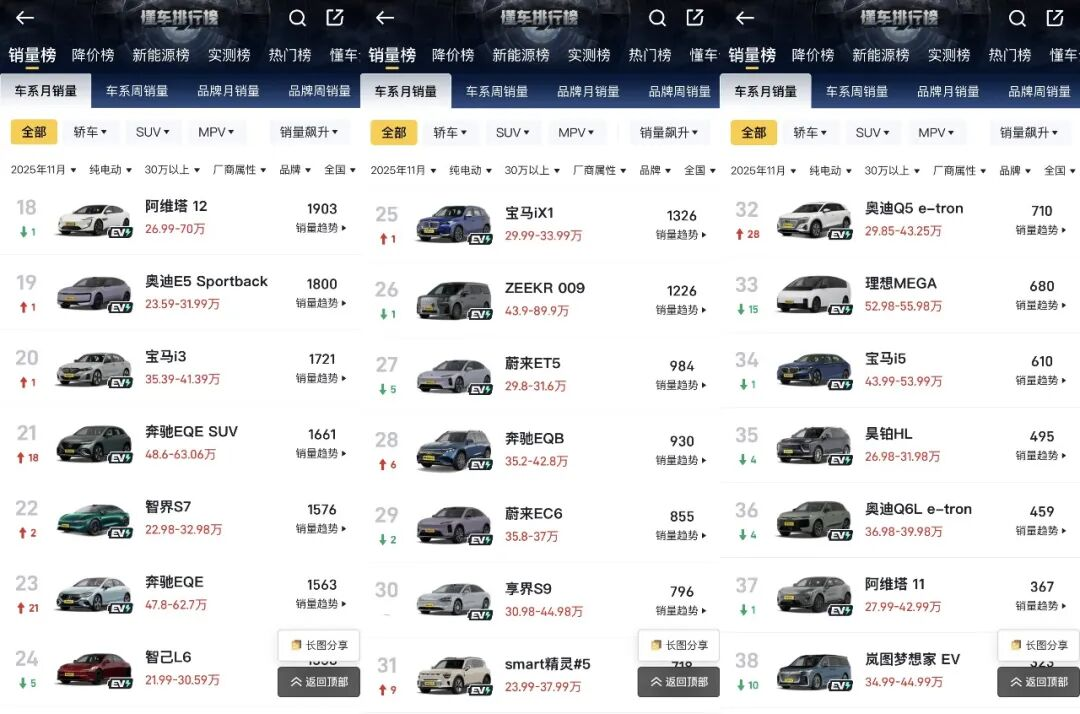 2025年11月,30万元以上的高端纯电车型月销量低于2000辆的车型,图片来自:懂车帝